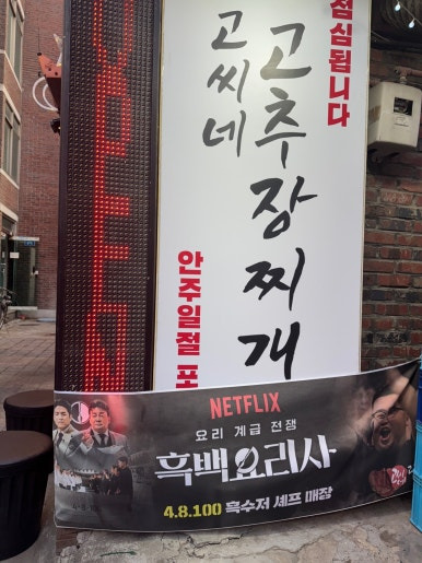 - 사장님은 TV 프로그램 '흑백 요리사'의 흑수저 셰프로 출연했다.(매장 앞에 현수막을 통해 알 수 있음)