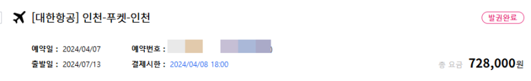 필자는 `24년 4월 대장님과 푸켓행을 결정하였고 바로 티켓을 구매하였다. 첨부사진에는 70만원으로 되어있으나, 할인 전 금액으로 표기되어 있으며 최종결제금액은 60만원대 였다. 결제 당시에는 평범하게 구매한줄 알았으나 `25.04.14. 기준 항공권을 찾아보니 미련한 선택이었다. 대한항공 기준 50만원 중반...